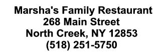 Ded Reckoning from Albany: I87 North to EXIT 23 Warrensburg; short left to NY Rte 9; North on Rte 9 to NY Rte 28; North on Rte 28 to NY Rte 28N; short right to Main Street; left on Main Street to Marsha's on right.